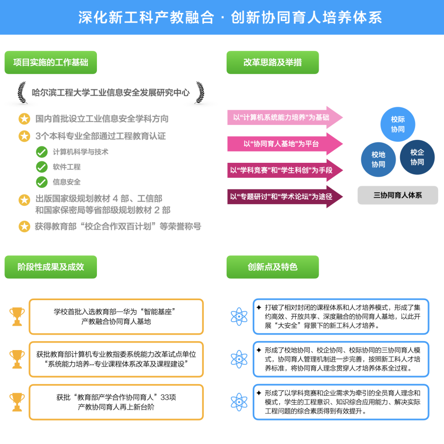 本项目依托工业和信息化部校企协同育人示范基地—哈尔滨工程大学(以下简称“我校”)工业信息安全发展研究中心协同育人基地开展,基地在国内首批设立了工业信息安全新工科方向,所依托的计算机科学与技术、软件工程和信息安全3个专业全部通过工程教育认证,并入选“双万计划”建设行列。基地聚焦国产、自主、安全的“大安全”人才战略,与华为、中软等企业深度合作,获教育部“校企合作双百计划”等支持,育人成效显著。