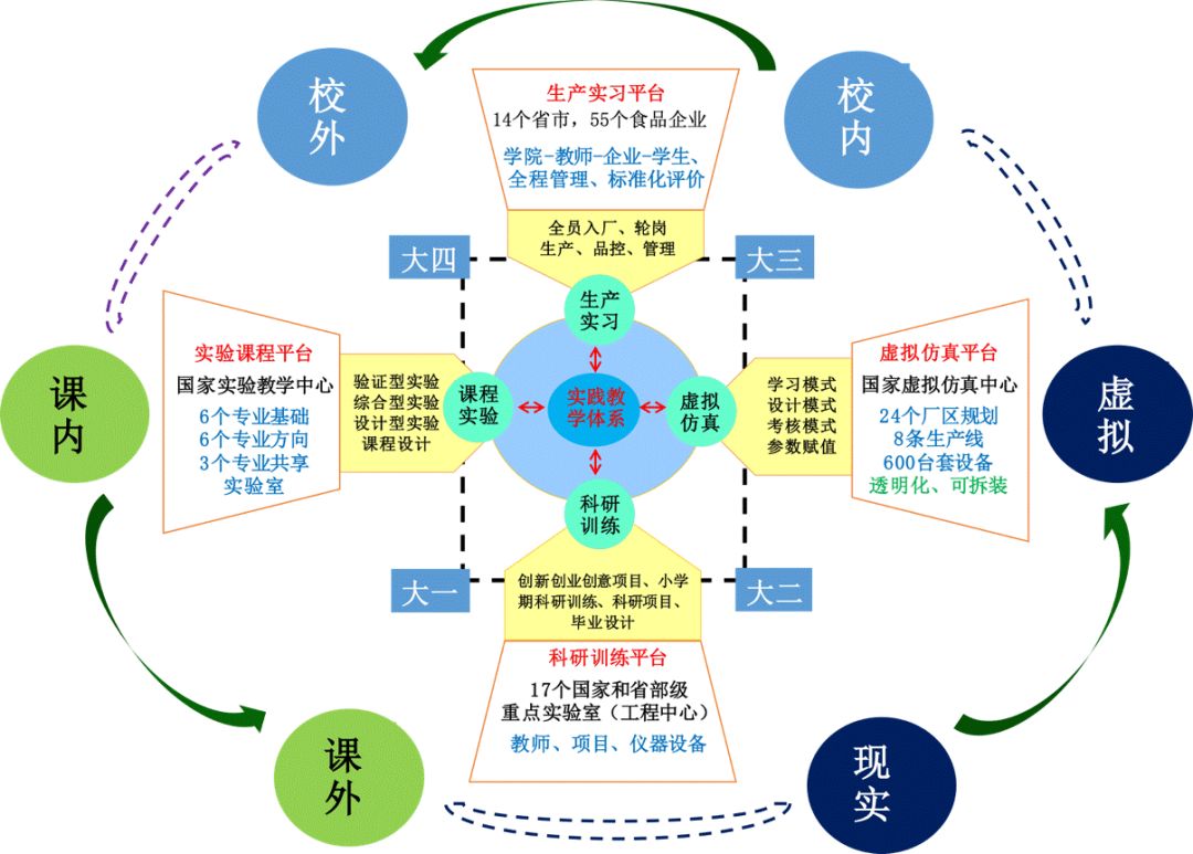 整合校内优势资源、拓展社会资源,持续建设培养现代食品产业急需人才的“课程实验、科研实践、虚拟仿真、生产实习”四平台,支撑三结合的教学理念。