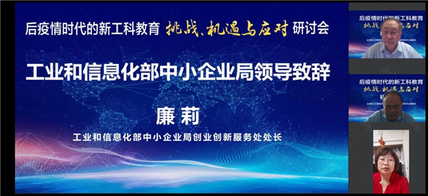 廉莉致辞。她围绕新工科教育分享了我国中小企业在产学合作和用人需求方面的情况。她强调,今天参会嘉宾既有高等教育界的资深专家和知名学者,还有产业界的企业家,希望产学协同育人,进一步促进新工科教育从供给侧和需求侧两端工序对接。在此过程中,新工科教育将对构建国内国际双循环新格局战略人才支撑发挥不可替代的重要作用。