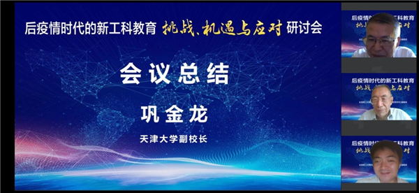天津大学副校长巩金龙介绍了天津大学新工科教育推进实践最新进展并作会议总结。他指出,天津大学设计实施新工科建设“天大方案-CCII”,并基于实践持续创新,目前已迭代至“天大方案”2.0。学校按照全面推进、重点突破的原则,通过建设“未来智能机器与系统平台”“储能平台”“智慧城市平台”等校、院、专业三级新工科人才培养平台,差异化、梯度式推动“天大方案”落地生根,引领学校人才培养综合改革持续深入推进。他系统梳理了本次研讨会的主题脉络和取得的丰富的理论共识与成果。他表示,本次会议研讨了后疫情时代新工科教育面临的新挑战、新机遇,明晰了中国工程教育发展的新方向,谋划了新工科教育发展的新未来,取得了很多极具价值的共识,将有助于指导新工科教育走向扎扎实实的推进落实和质量提升,引领“四新”建设行稳致远,推动高等教育“质量革命”走向深入。