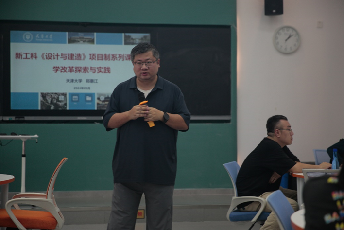 工作坊三由天津大学机械学院《设计与建造》教学团队成员郑惠江主持,主题为《“思维、知识、能力有机结合”的<设计与建造>新工科项目式课程建设》。从《设计与建造I-IV》进阶式项目制课程的改革思路讲起,系统阐述如何通过三类五种项目的开展,达到重塑知识边界的目的,系统培养学生的综合能力,实现思维、知识、能力的有机结合。详细介绍《设计与建造I-IV》系列课程中不同教学阶段的课程教学目标、课程环节设计以及评价体系的创新。过程中,提出“工程是什么?”的问题引发与会老师讨论,并围绕科学、艺术、工程的内涵开展了热烈交流。