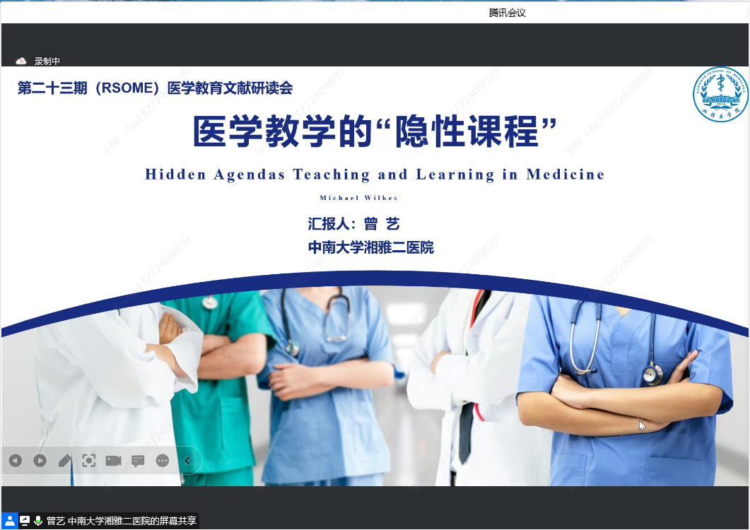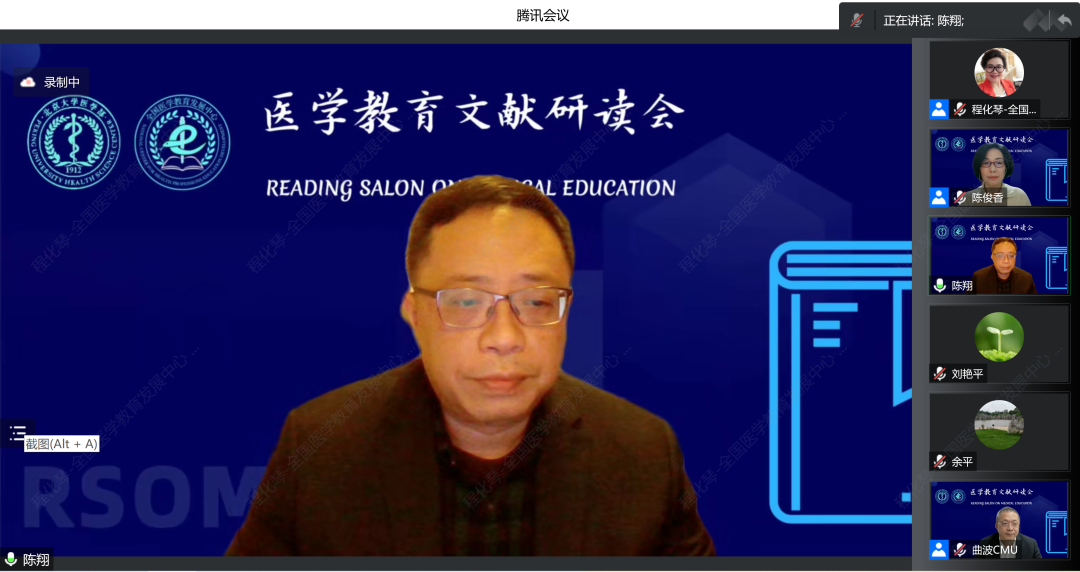 2023年1月13日晚,由北京大学医学部、全国医学教育发展中心研究联盟和中国高等教育学会医学教育专业委员会主办,中南大学湘雅医学院承办的第二十三期医学教育文献研读会顺利举办。本期文献研读会的主题是“职业责任:教育和医疗改革的根本问题”,来自全国医学院校的近200名医学教育专家、教学管理人员及教师参加了本次线上研读会。研读会由中南大学湘雅医学院副院长陈俊香教授主持,邀请中南大学湘雅三医院庄权副研究员、中南大学湘雅二医院曾艺教授和中南大学湘雅医院欧阳洋副教授进行文献分享,中国医科大学副校长曲波教授进行评议。