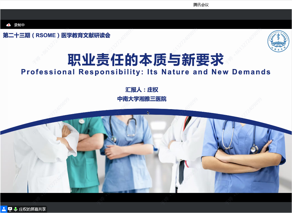 庄权副研究员重点分享了“职业责任的本质与新要求”一章。他分别从职业责任的本质、职业责任的预期行为、医学教育中职业责任的新要求三个方面展开讲解,同时以中南大学湘雅三医院在抗击新冠疫情期间,医务工作者坚守一线,富有使命感和担当的行医素养为例,强调了医学教育中职业责任的新要求。