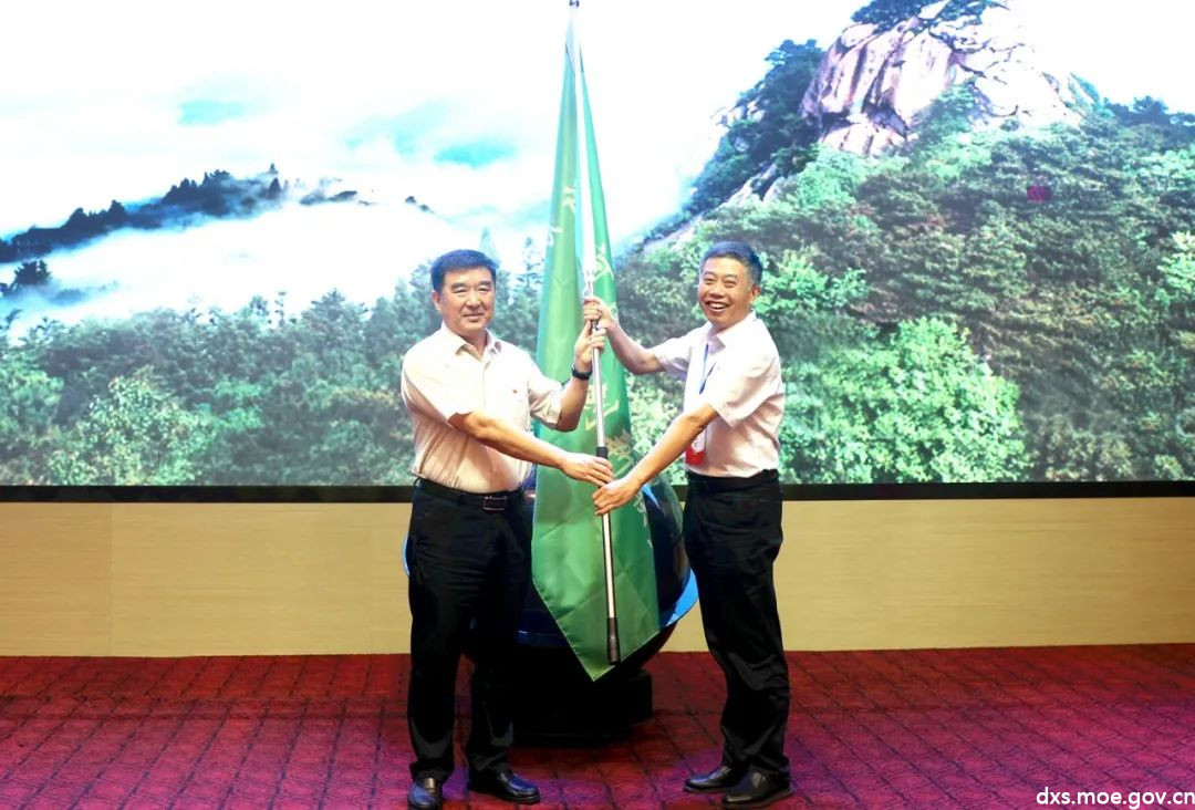 河南省教育厅党组成员、副厅长、一级巡视员刁玉华向联盟秘书长冯建灿授旗