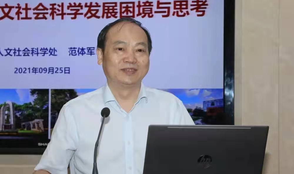 范体军作了题为“理工科高校人文社会科学发展困境与思考”的发言,他提出面对新时代国家重大战略需求、全球新技术变革、新文科建设要求的挑战和机遇,要立足中国国情,扎根中国大地,强化思想价值引领,育新时代文科人才;依托学校优势学科,对接国家地区需求;推动学科交叉融合,聚焦特色研究领域;形成研究新增长点,打造华理文科品牌。在立德树人育人育才方面,要提升学生政治素养、加强前沿理论传播、增进社会现实理解、提升人文内涵修养,培养有自信心、自豪感、自主性的人;在专业交叉融合探索方面,要新设交叉融合本科双学士学位,改造升级原文科专业,发展文科新兴专业;在科研发展方面,要强化基础和前沿理论研究,建构中国特色理论话语体系,提升学术及社会影响力;做实做强社会科学高等研究院,全力承担国家重大战略,服务区域、产业发展需求;打造交叉团队,建立产学研合作平台,形成重大成果。