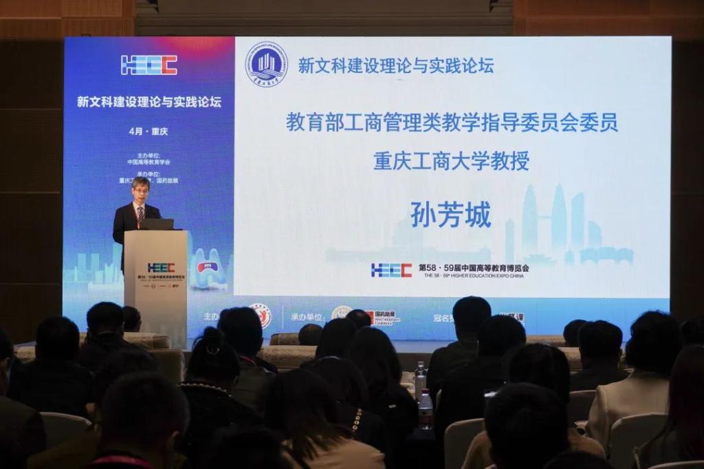 孙芳城以“新文科背景下的商工融合实践与探索”为题作主题报告。他从重庆工商大学的自身基础出发,依托学校商工专业发展基础,提出“商工融合、双擎驱动”,分析了学校商工融合的基础、分享了学校商工融合的探索,也提出了新的思考。