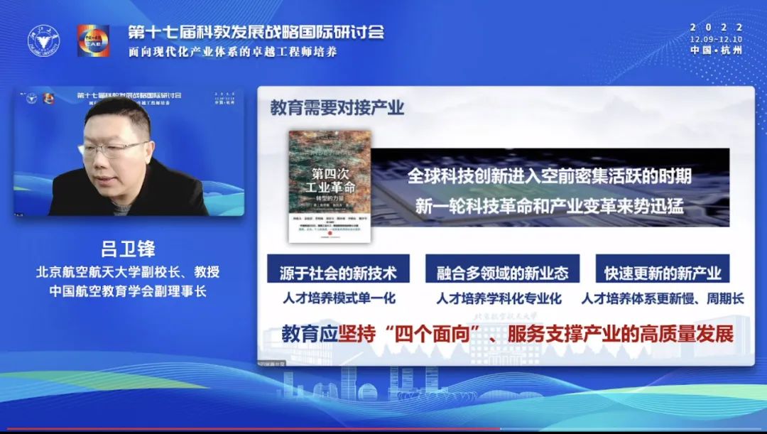 北京航空航天大学副校长,中国航空教育学会副理事长吕卫峰教授分享了《以服务国家为最高追求,探索卓越工程师自主培养的北航之路》的报告。他首先介绍了卓越工程师培养的全球经验,认为其总体思路是通过精英教育培养卓越工程师,核心理念培养过程与科技经济发展紧密结合,主要特征是一流高校与一流企业开展深度产教融合,多学科交叉引领技术变革推动产业发展。接着他介绍了北京航空航天大学的实践,北航源源不断为国家培养输送堪当大任的创新领军人才和卓越工程师。最后,吕教授从北航理解、总体布局、创新试点、总体思路、体制机制转变、能力转变、评价转变等方面总结了北航在培养卓越工程师的创新探索。