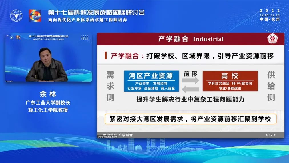 广东工业大学副校长、轻化工学院余林教授做了题为《面向湾区,产学融合(跨学科多专业新工科人才培养的创新与实践)》的报告。他从改革背景、育人实践、发展成效和广工新局四个方面介绍了广东工业大学新工科人才培养的经验。广东工业大学地处粤港澳大湾区的特殊特地位置,在“双区“引领+”双十“驱动的区域布局下,广东工业大学要面向粤港澳大湾区重点行业/领域重点培养紧缺目录人才。广东工业大学坚持五位一体,通过打造”5I“体系来培养新工科人才。”五位一体“是指以载体创新为特色、以产学融合为支撑、以价值塑造为引领、以产业需求为导向、以学生发展为主题;”5I“是指港湾协同(Inter-zone)、创新创业(Innovation)、拔尖创新(Intelligent)、产学融合(Industrial)以及学科交叉(Interdisciplinary)。