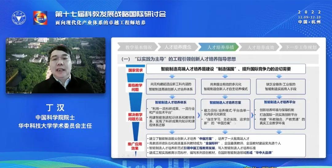 中国科学院院士、华中科技大学学术委员会主任丁汉教授作了题为“面向新工科的智能制造创新人才培养体系构建与实践”的报告,重点介绍了华科大的人才培养理念。他指出,智能制造人才培养最主要突出需要解决的问题是创新能力的提升。我们需要新的智能制造高端培养的体系,多元化的自主培养体系,以及全链条的工业级的实践育人平台。依托“家国情怀、科学精神、大工程观”培养“厚基础、宽口径、重实践、个性化”的国家智能制造顶尖拔尖人才。