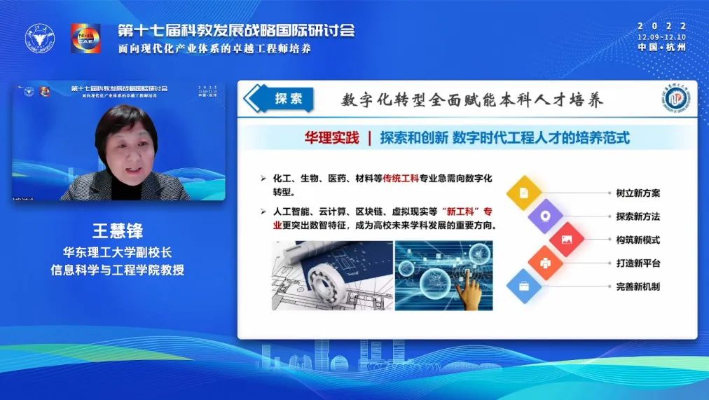 华东理工大学副校长、信息科学与工程学院王慧锋教授做了题为《面向“数字中国”战略的卓越工程师培养——数字化转型背景下高等工程教育的“华理经验”》的报告。她认为数字化转型给卓越工程师的培养带来了新机遇、新挑战,尤其表现在人工智能、大数据等新一代数字技术与实体经济的深度融合,新一代数字技术与基础学科的交叉融合,数字经济发展和“数字中国建设对人才培养提出新要求等。接着,她从树立新方案、探索新方法、构筑新模式、打造新平台和完善新机制等几个方面介绍了华东理工大学数字时代卓越工程师培养的经验。最后,她从智慧工程教育的五要素和六大任务两个方面展望了未来开展指挥工程教育培养卓越工程师的愿景。