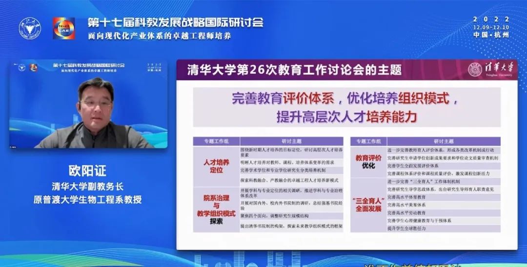 清华大学副教务长、原普渡大学生物工程教授欧阳证作了题为“清华大学高层次工程人才培养模式的探索”的报告。他指出,我国大学发展的下一个阶段是具备自主培养具有创新能力的人才的能力。在新时代下,我们应该考虑从基础门类的方向来培养本科生,保留本科培养的宽度,在研究生阶段往强专业以及交叉专业的方向来输送人才。这种培养模式的优势在于让学生有能力从更广阔的知识基础,能够发展新的行业来定义专业。