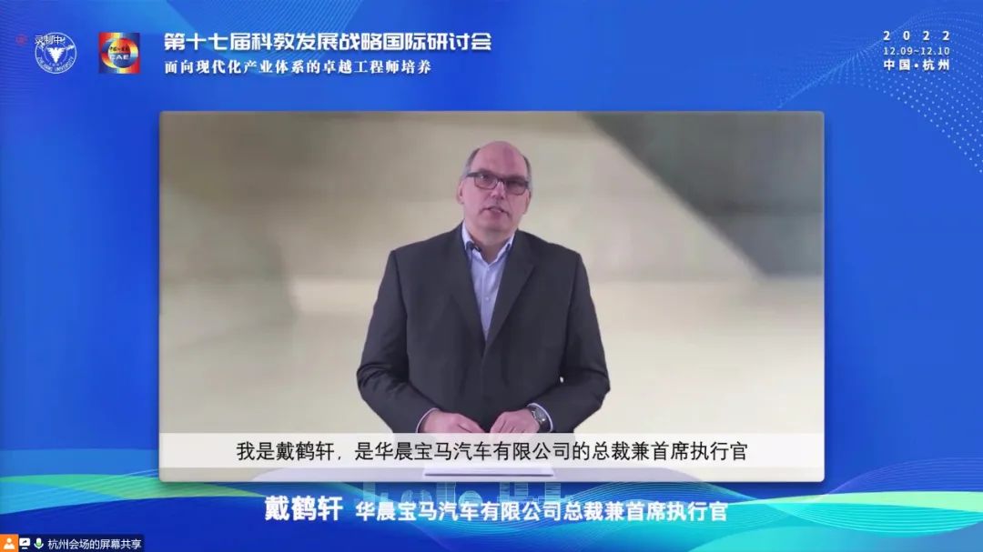 华晨宝马汽车有限公司总裁兼首席执行官戴鹤轩以视频录制的形式带来了题为《Planting the seed: the importance of education and cultural encounter for creation of the innovation engineer of tomorrow》的报告。宝马作为中德合作最成功的企业之一,融合了德国工程学和中国速度、工艺与创新、创意与严谨。戴鹤轩探讨了三个问题:一是如何创造一个促进创新的环境,二是如何培养能够塑造未来的工程师和人才,三是如何建立开放的文化,并在文化、学科和学院之间架起桥梁。针对第一个问题,他认为要创造一个良好的多学科环境,要创造一个能够在研究和应用、高校和企业之间架起桥梁的环境,要创造一个硬件设施齐全、文化氛围良好的化境。针对第二个问题,他认为不仅要培养具有专业素养的工程师,还要培养具备团队精神、开放态度和具有良好品格的工程师,而这需要从幼儿教育就开始激发儿童的科学兴趣。针对第三个问题,他认为要让年轻人敢于犯错以及拥有谈论错误的能力,在社会层面要以研究最新技术并成为全球进步的一部分。