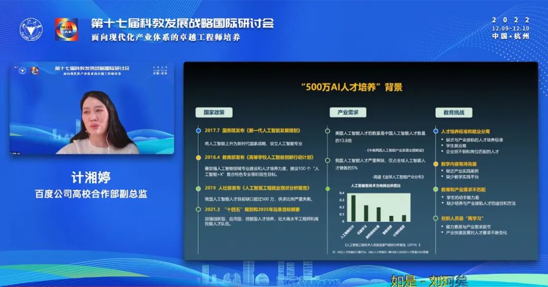 百度公司高校合作部副总监计湘婷作了题为“人人皆可AI,百度人工智能实践案例解读与思考”的报告。她从工业界视角出发,认为2022年开始,学校和社会对人工智能的态度正在变得越来越冷静和平和,各行各业都在探索行业的真正落地。中台技术如何应用到各个业务上、业务上的部署、技术的理解这些是架构师人才培养的新需求。