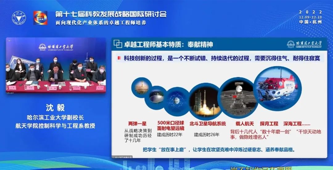 哈尔滨工业大学副校长、航天学院控制科学与工程系沈毅教授作了题为“弘扬优良传统,肩负时代使命,自主培养新时代卓越工程师的探索和实践”的报告。他指出,哈尔滨工业大学把自主人才培养、学术型和专业型进一步明确和清晰,以此形成培养目标定位。此外,正在把专业学位的三分之二左右的学生逐渐落实到卓越工程师学院,进行一些跨学科、跨地域的交叉培养,同时实现本硕博贯通,面向行业领域培养他们工程实践的能力。